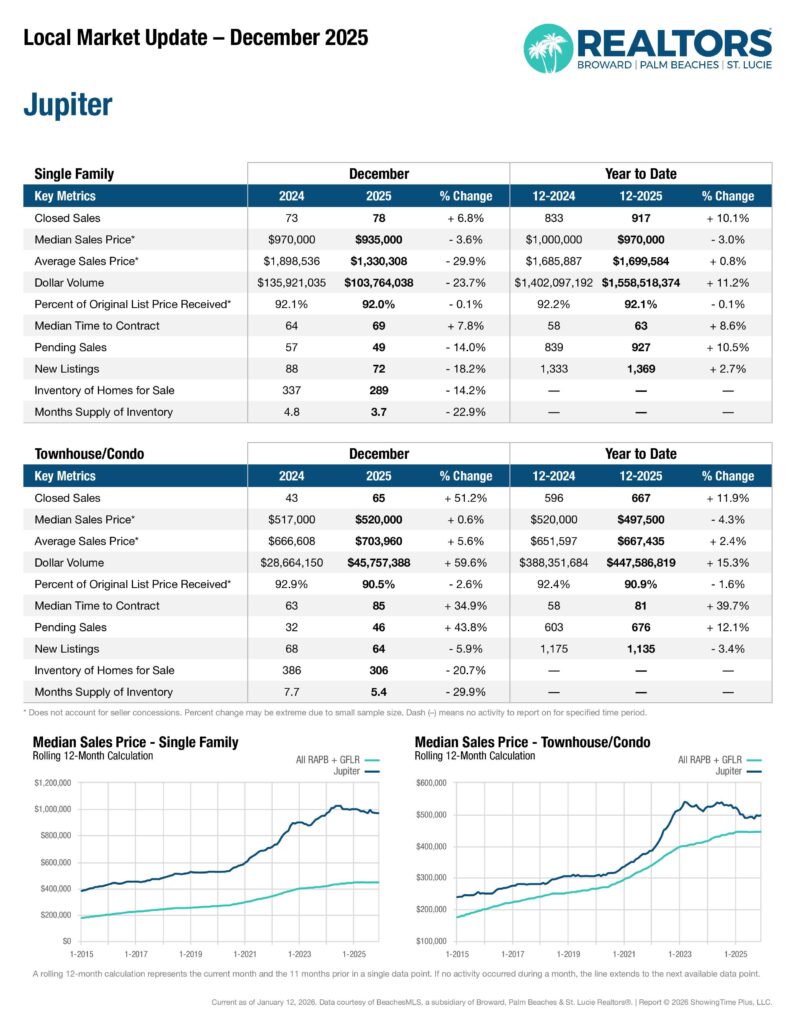 Happy New Year! The Realtors Association of the Palm Beaches just released their December 2025 housing sales numbers and these are also the defacto year end numbers as well. I see the trend as going int he right direction. The key metric looking ahead is the months suuply of inventory which for houses has decreased from 4.8 to 3.7 months, and for condos and town houses has gone from 7.7 to 5.4 months. This is GREAT news! The median sales price has gone down just 3% for houses and 4.3% for condos. Not great but not a cliff either. While the number of closed sales have increased from 2024 by 10.1% for houses and 11.9% for condos. And the dollar volume has gone up 11.2% for houses and 15.3% for condos. Bottom line is that we are selling 10.1 or 11.9% more units for 3% or 4.3% less money. Fewer units for sale is why we see a lower months supply of inventory and less inventory allows for prices to go up. Supply and demand.